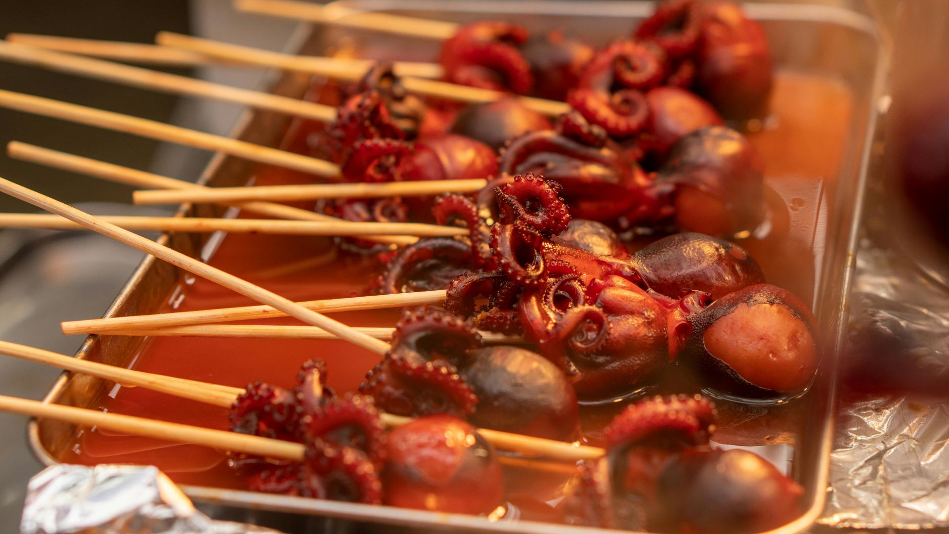 Another iconic street food—though, please sit down or stand away from pedestrian traffic as eating and walking is considered impolite—is tako tamago. This dish may be a hard sell for less adventurous eaters, but vacation is a great opportunity to get out of your culinary comfort zone. Tako tamago is skewered baby octopus with a hard-boiled quail egg stuffed inside the head, then candied in barbecue sauce. It's rich, slightly chewy, and oddly adorable.