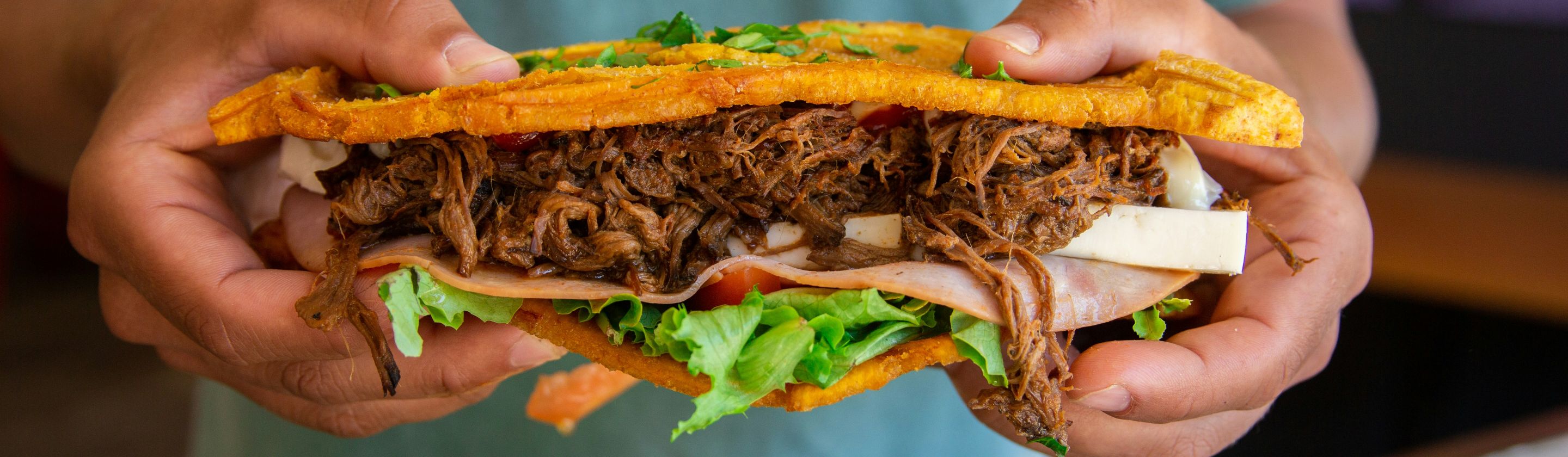 This Puerto Rican sandwich uses smashed and fried plantain in the place of bread. It's traditionally filled with meat, lettuce, tomatoes, cheese, and garlic mayo. It's a sweet and savory sandwich with a variety of delightful textures.